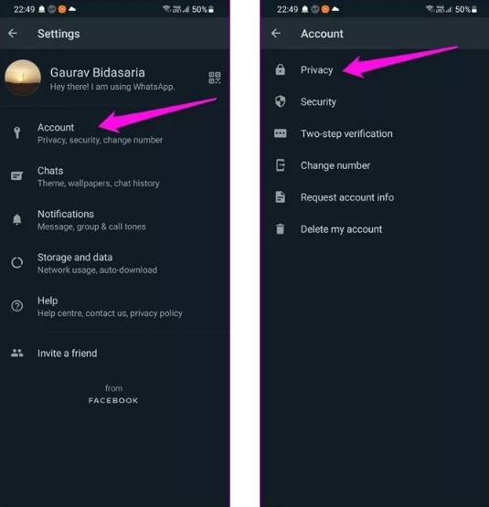 - الضغط على خيار الحساب Account ثم تحديد خيار الخصوصية Privacy option من القائمة.
