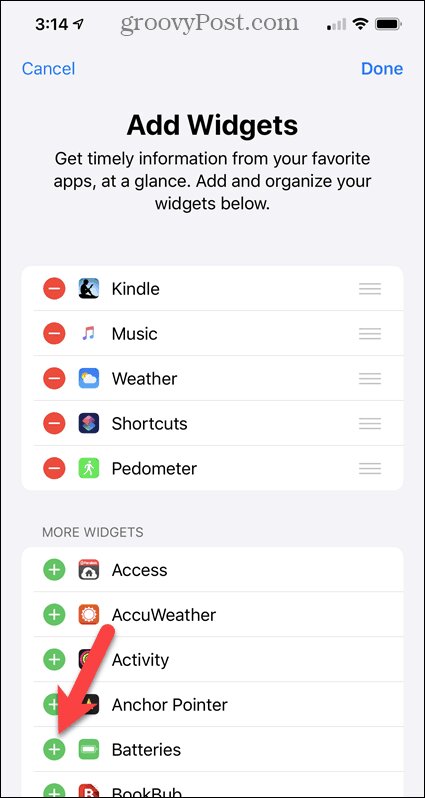 - الآن في شاشة إضافة عناصر Add Widgets قم بالتمرير لأسفل حتى تجد البطاريات Batteries.