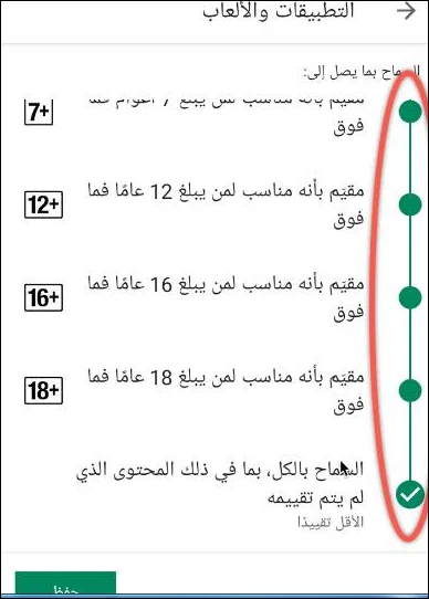 • ثالثا واخيرا : الان عليك بتحديد عمر الطفل الذي من خلاله تتم فلترة التطبيقات التي تناسب العمر لكن لا تنسي الضغط علي حفظ ،كما بالصوره التاليه