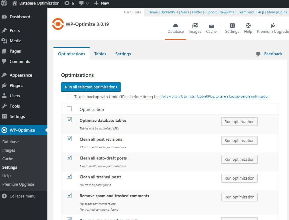احد اهم عناصر تلك القائمة هو إضافة wp-optimize فهو يقوم بالعديد من المهام التي من شأنها ان تساعد على تحسين موقعك و استقرار اداؤه مثل تنظيف قاعدة البيانات الخاصة بك و ضغط الصور و تخزين موقعك مؤقتًا بالاضافه الى التخزين المؤقت و يمكنك ايضا تصغير CSS و JavaScript وإلغاء تزامنهما .