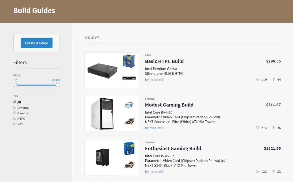 في كثير من الأحيان نستعين من خبرة أصدقائنا من حولنا الملمين بأمور الكمبيوتر وقطع الهارد وير بشكل عام لأن لهم دراية كبيره بهذا الشأن، وهذا ما تقدمه هذه الخدمة بحيث تقوم بإستعراض التجميعات التي قام بها المستخدمين والأعضاء بعد شرائها وتدوينها ع الموقع وبالصور أيضاً وهذا شئ جيد جداً لترى القطع بعد تركبيها مع بعضها البعض ولتقرر ما إن كان الشكل يرضيك أم لا، سواء في اللون أو تصميم القطع وألوان ال RGB وغيرها من الأمور الآخرى.