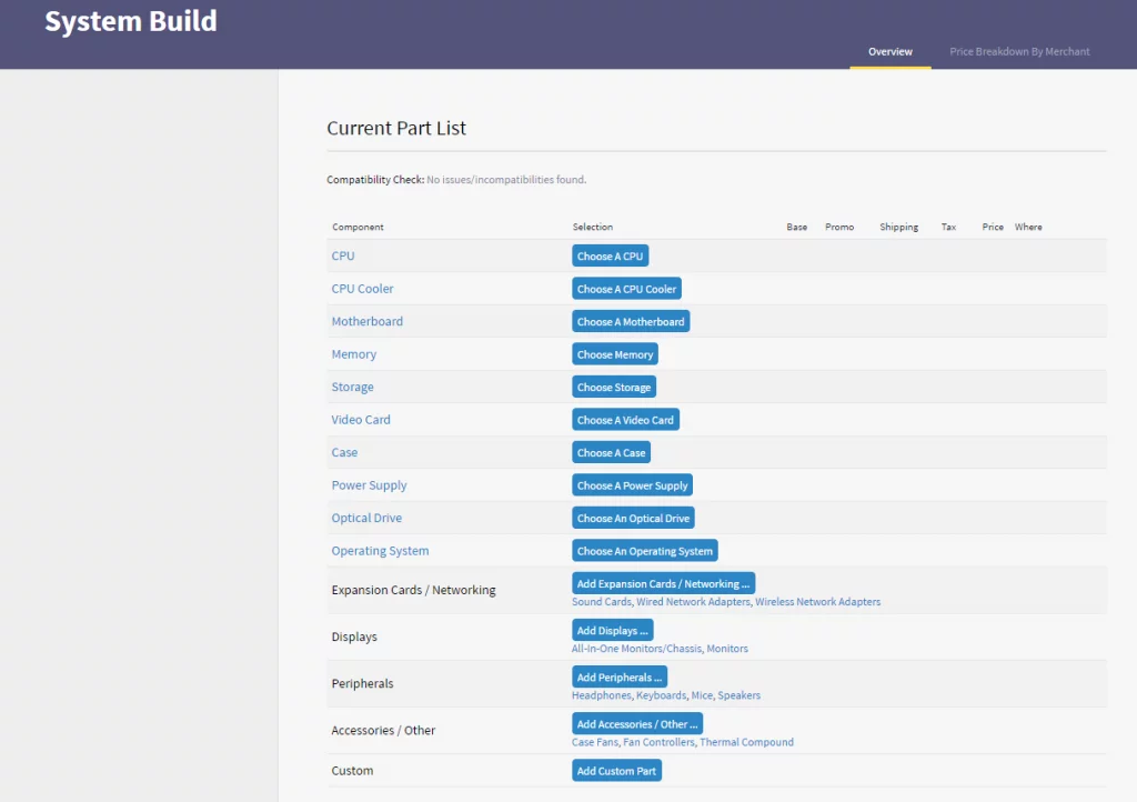 هذه الخدمة تقدم لك أفضل وسيلة للقيام بإنشاء تجميعة خاصة بك في عام 2020 وتقدم لك كل القطع التي ممكن أن تتخيلها جميعها في صفحة واحده بمجرد ضغطك على المربع الأزرق هذا لأختيار القطع المناسبة لك، والجميل أيضاً أنه عند إختيار معالج ما كمثلا معالج من إنتل من الجيل الثامن i7-8700K وبعدها قمت بالضغط على المربع الخاص باللوحة الأم أو ال Motherboard سيقوم بإختيار لوحة الأم التي تتوافق مع هذا المعالج بالتحديد وسيقوم بظهور جميع لوحات إنتل التي تعمل بشريحة Z370 فقط وليس غيرها، وهذا جيد جداً لضمان توافقية 100% مع القطع التي تمكنت من إختيارها، بالإضافة أنه هذا يحدث أيضاً مع باقي القطع من التجميعة، ويقوم بتنبيهك أعلاه بأنه هذه التجميعة كم ستحتاج من قدرة ال Watt من مولد الطاقة، لتعلم ما الذي يمكنك إختياره، والجميل أيضاً أنه يمكنك إضافة قطع من مواقع خارجية بمجرد إضافة الرابط الخاصه بها فمثلاً منتج يعينه موجود على موقع أمازون الشهير وغير موجود على موقع PCpartpicker ف يمكنك هنا إضافته مع باقي القطع وجمع السعر للتجميعة.
