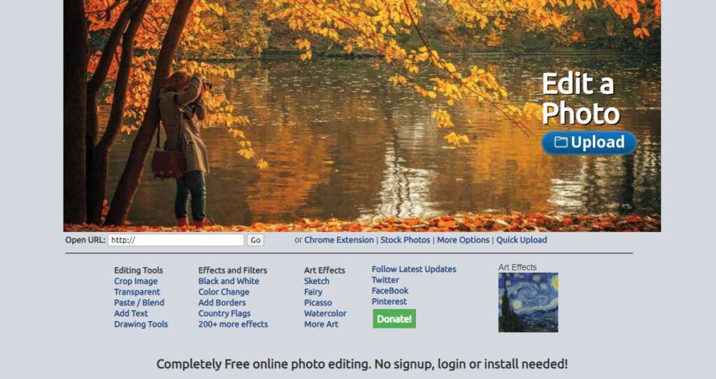 هو موقع بسيط يساعدك على تعديل الصور اونلاين مجانا بشكل اقل احترافيه من المواقع التي قمنا بذكرها سابقا و يحتوي على أدوات تحرير الصور في شريط الادوات و سلسلة من خيارات القائمة في الجزء العلوي و روابط و أزرار لأدوات اخرى و يمكنك التعديل في الصور بشكل مبسط من حيث الالوان و الاضاءه مع امكانية إضافة تأثيرات نمطية وحتى إنشاء رسوم متحركة بسيطة و هو مجاني للاستخدام و بسيط للمبتدئين .