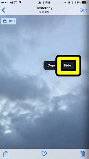 • في البداية عليك القيام بفتح الصورة التي ترغب في إخفائها، وبعد ذلك قم بالضغط على الصورة لحين ظهور خيارcopy/Hide، وبعدها قم بالضغط علىHide، ومن ثم قم بتأكيد خيار الإخفاء.