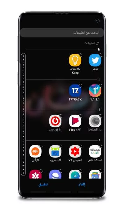 - بعد ذلك سوف تظهر لك شاشة تشمل كافة التطبيقات التي تم تثبيتها على الهاتف الخاص بك وبما فيها التطبيقات التي قمت بتثبيتها سابقاً، وبالتالي ما عليك سوى النقر على التطبيقات التي ترغب في إخفائها، ومن ثم قم بالضغط على تطبيق في أسفل الشاشة.