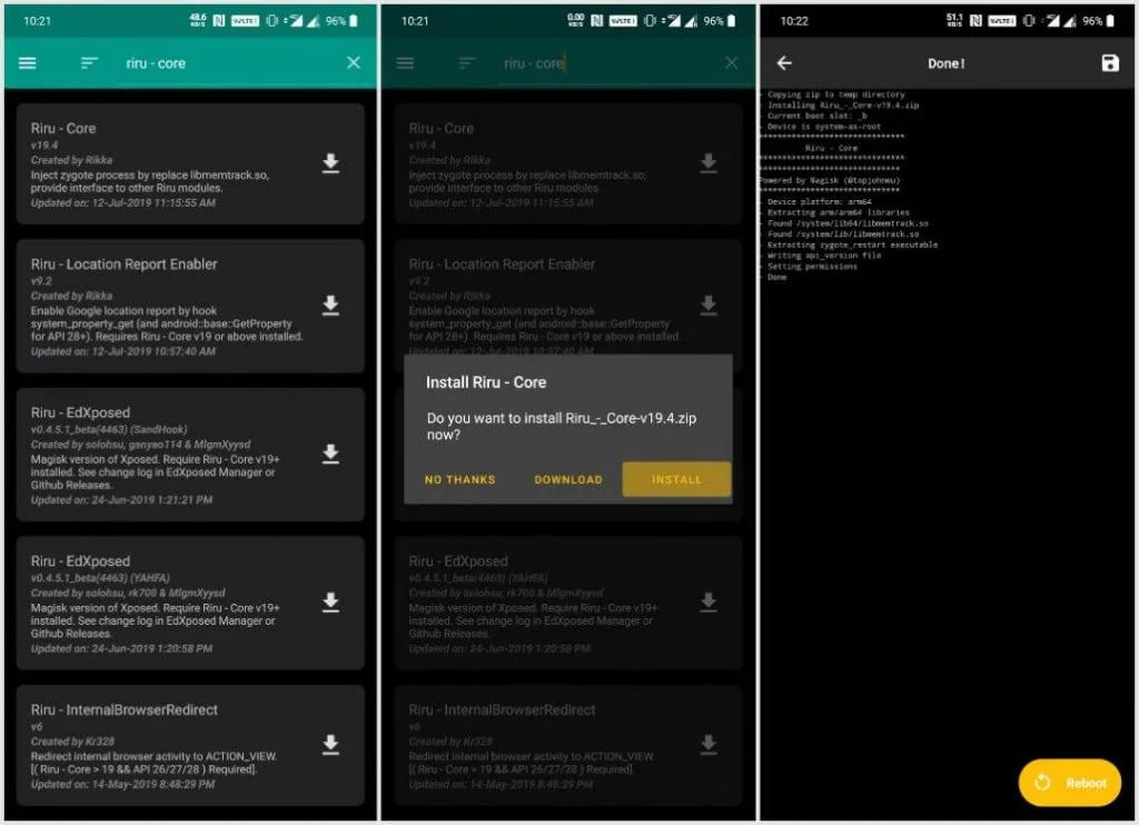أولًا نحتاج إلى تثبيت core Riru Magisk module على الهاتف أولًا ويتم ذلك كالآتي: