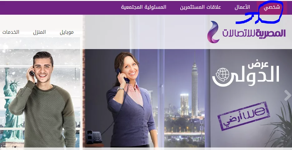 1. في البداية عليك الدخول إلى الموقع الرسمي لشركة We أو المصرية للاتصالات من خلال الرابط التالي (اضغط هنا) ومن ثم عليك الانتقال إلى خانة “شخصي” المتواجدة في أعلى الموقع، كما هو موضح في الصورة التالية.