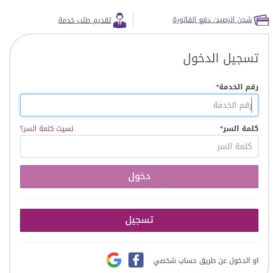 3. من هنا ستجد أنه ظهر أمامك صفحة لتسجيل الدخول، يجب عليك إدخال رقم الخدمة والرقم السري في الخانات الصحيحة وبعد ذلك الضغط على كلمة “دخول” المتواجدة في الأسفل، ومن ثم ستجد أنك نجحت في الدخول إلى حساب الأنترنت الخاص بك، لذلك يجب عليك بعد ذلك إدخال كود المحافظة ورقم التليفون الأرضي الخاص بك، وكذلك رقم الهاتف الخاص بك الذي تم تسجيله في عقد توصيل الخدمة الشهرية بالنت.