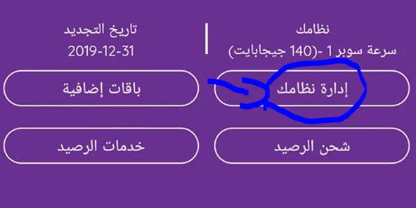 2. في هذه الخطوة سيكون عليك اختيار خانة “إدارة نظامك” من القائمة التي سوف تظهر لك وبعد ذلك ستجد إن تفاصيل باقتك بالكامل ظاهرة أمامك من حيث السرعة والاستهلاك وحتى سعة التحميل وأيضًا موعد تجديد الباقة والتكلفة وكل شيء.