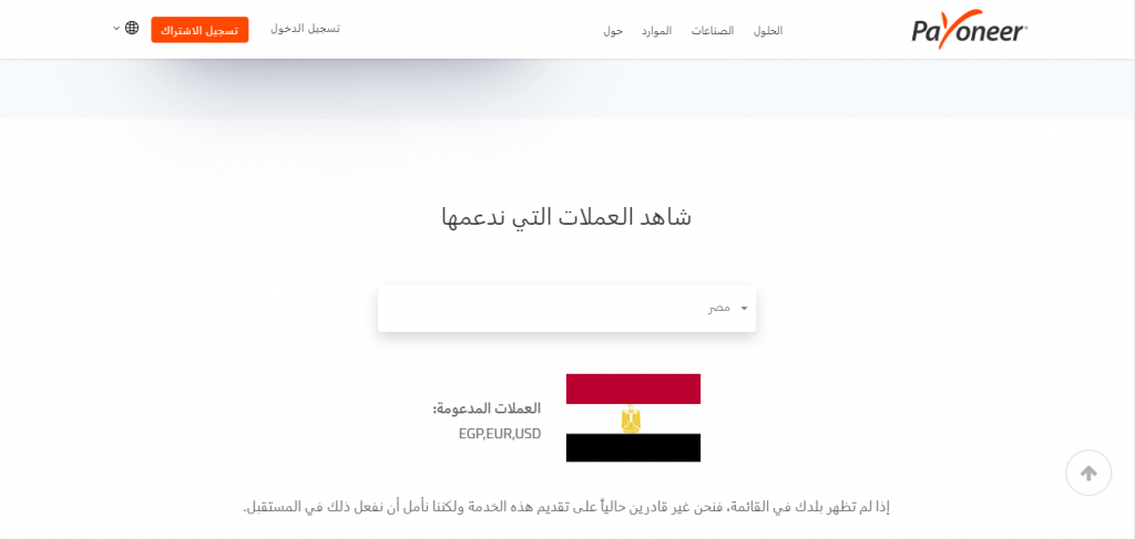 على سبيل المثال عند اختيار مصر، تظهر العملات التي تدعمها وهي اليورو والدولار الأمريكي بالإضافة إلى العملة المحلية وهي الجنيه المصري.