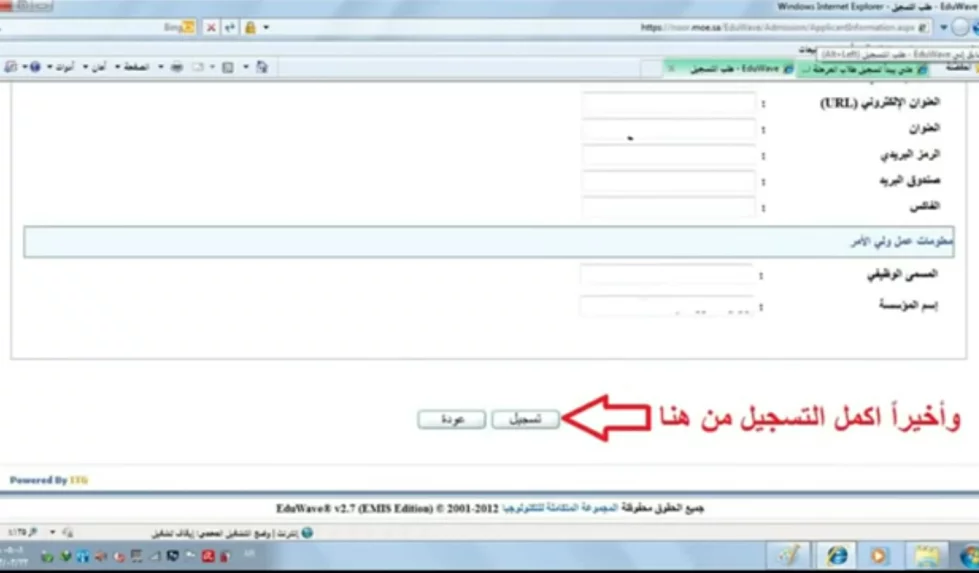 بعدالإنتهاء من إدخال كافة البيانات الشخصية المطلوبة في حقولها الصحيحة، نقوم بالضغط على تسجيل.