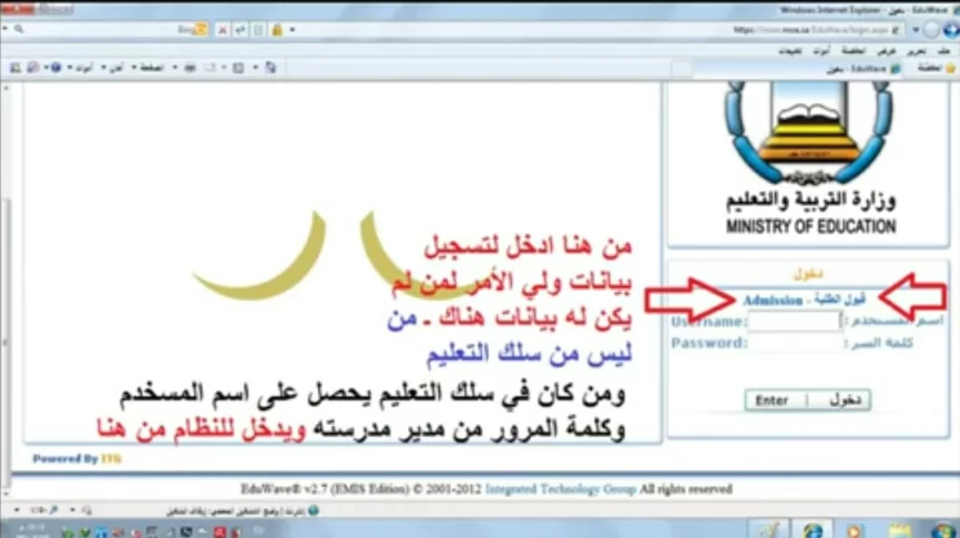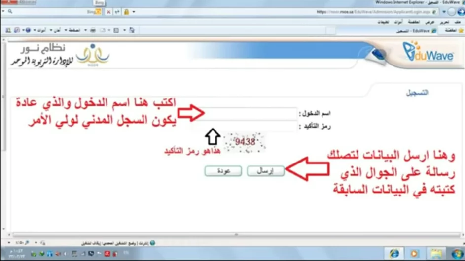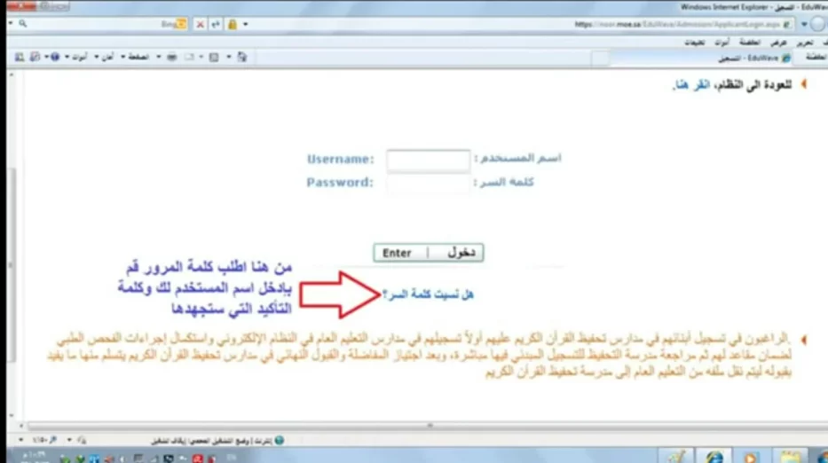 أما في حالة كان ولي الأمر في سلك التعليم فيمكنه الحصول على اسم المستخدم وكلمة المرور من مدير مدرسته، وإدخال هذه البيانات أمام خانة اسم المستخدم وخانة كلمة المرور.