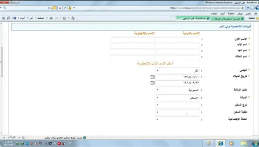 في هذه الصفحة سنقوم بمليء هذه الحقول بالبيانات المناسبة حسب المطلوب، في خانة الجنسية نقوم باختيار الجنسية من القائمة المنسدلة في هذا الحقل.
