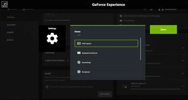 - إذا كنت تستخدم كرت شاشة حديث من إنفيديا ويدعم تقنية ShadowPlay، إذن فتستطيع إظهار عداد الفريمات في اللعبة عن طريق الاستعانة ببرنامج NVIDIA GeForce Experience الذي يُثبت بشكل تلقائي مع تعريف كرت الشاشة على الجهاز.