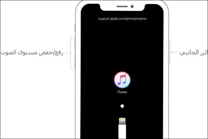 يعد هاتف الايفون iPhone X أحدث الهاوتف التي صدرت مؤخرا من جانب شركة ابل ، بعد غجراء الخطوات السابقة قم بالضغط علي زر رفع الصوت واتركة بسرعة ثم كرر الخطوة علي زر خفض الصوت وقم بالضغط علي زر الباور لفترة حتي تظهر ايقونة الايتونز علي الشاشة كما بالصورة .