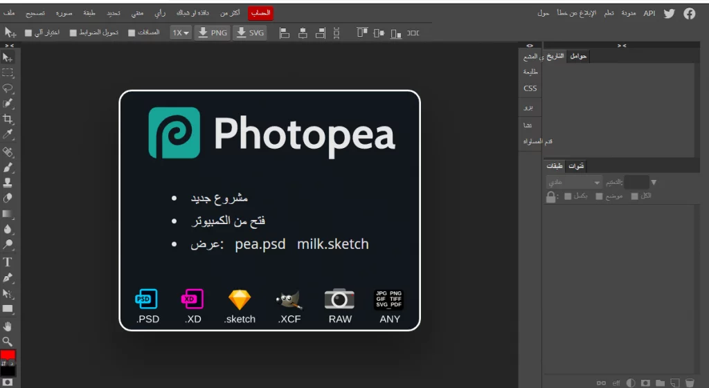 - يدعم برنامج Photopea الكثير من التنسيقات الخاصة بالملفات مثل JPG و PSDو PNG و XDو Sketchو SVG، وذلك يجعل البرنامج سهل في الاستخدام بالإضافة إلى أنه متعدد المنصات.