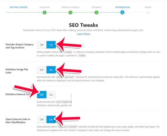 7- وفي الخطوة الأخيرة سيكون عليك ببساطة تنفيذ الخيارات المتواجدة في الصورة الموضحة أمامك في الأسفل وهي تشغيل كل من الخيارات المتعلقة بالوسوم الأرشيفية والصور وفتح الروابط الداخلية في صفحة جديدة لأن هذا الأمر سيساعد كثيرًا في زيادة عدد الزوار على مدونتك إلى جانب إنه سيحقق لك عائد مادي كبير، وبعد الانتهاء من ذلك عليك فقط إغلاق تشغيل خاصية عدم متابعة الروابط الخارجية لأنه إذا قمت بتشغيله فستخسر عدد كبير من زوارك وبالتالي سيؤثر ذلك على ترتيبك على محركات البحث لذلك عليك التأكد 100% إنك قمت بإغلاق هذه الخاصية للأبد.