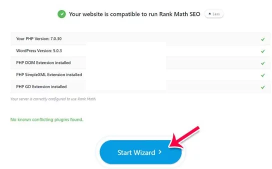 2- بمجرد تنشيط الإضافة على الووردبريس ستجد أن هناك صفحة ظهرت أمامك تعرض لك ما إذا كانت هذه الإضافة ستتناسب مع موقعك أم لا، وفي حالة ظهور أي خطأ يمكنك التعرف عليه بالكامل من خلال النقر فوق زر “المزيد” لمعرفة التفاصيل، أما إذا لم يكن هناك أي خطأ ستجد أن الإضافة تم قبولها بسهولة وسيكون عليك الضغط على Start Wizard