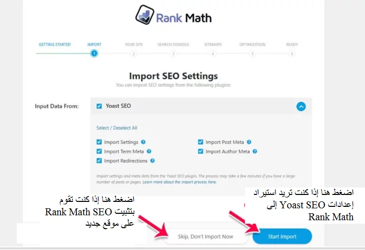 3- في هذه الخطوة سيكون بإمكانك الاستفادة من إعدادات Yoast SEO الخاصة بك إلى إضافة Rank Math SEO الجديدة ببساطة لأنه من السهل ربطهم سويًا، ويعتبر أفضل جزء من هذا الإعداد هو أنك لن تفقد ترتيب صفحاتك على بحث جوجل إطلاقًا، ويمكنك القيام بهذه الخطوة بسهولة من خلال اختيار “استيراد جميع إعدادات” Yoast SEO واستيراد معلومات التعريف التي قمت بتعيينها لموقعك واستيراد البيانات الوصفية للوظائف والصفحات التي تتضمن عنوان تحسين محركات البحث (SEO) وبيانات Opengraph أيضًا.