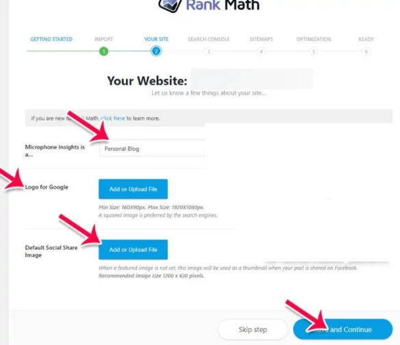 4- هنا سيكون عليك تحديد أنواع المواقع التي تديرها سواء كانت مدونه شخصيه خاصه أو موقع شخصي أو موقع أعمال صغيرة أو أي شيء أخر، وما عليك سوى اختيار واحدًا منهم والتي يجب أن تكون الوصف الأقرب إلى طبيعة نوع موقعك، بعد اختيار نوع موقعك ستجد إنه يمكنك تحميل شعارًا لموقعك، وفي حالة إذا كنت قد حملته بالفعل، فسيقوم Rank Math تلقائيًا بجلبه وعرضه لك، كما تمنحك هذه الخطوة أيضًا فرصة لتحميل صور افتراضية وهو خيار مفيدًا للغاية لأنه سيساعدك إذا نسيت إضافة صورة مميزة في أي من منشورات المدونة الخاصة بك فسيتم عرض هذه الصورة الافتراضية التي حملتها تلقائيًا.