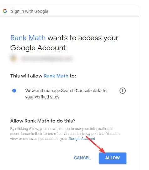 • بعد ذلك ستجد أن هناك مربع تأكيد ظهر أمامك يعرض معلومات حول الدخول على إضافة Rank Math، وكل ما عليك القيام به هو مجرد النقر فوق “السماح للتأكيد والمتابعة”.