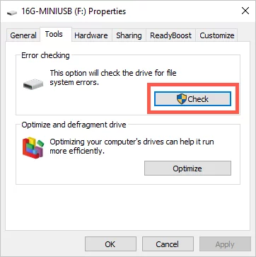 - في مربع الحوار “خصائص” ، انتقل إلى علامة التبويب “tools” ، ثم انقر على زر “check” ضمن قسم “التحقق من الأخطاء”.