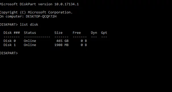 في حالة اعتقادك بأن فلاشتك صالحة سوف نبدأ بحل المشكلة ويتم ذلك عن طريق منفذ الأوامر cmd والذي من خلاله تستطيع التحكم في أجزاء الهارد ديسك وكذلك التحكم في الفلاشة الخاصة بك، ففي حال عدم ظهور الفلاش فيMy Computer فمن غير المحتمل عدم ظهورها على خاصية cmd لذلك أولاً في البداية عليك بالضغط على زر الويندوز مع حرفR حتى يتم فتح خاصية Run ومن ثم قم بكتابة الأمر التالی DISKPART.EXE وحينها سوف يفتح لك منفذ الأوامر بطريقة مباشرة، ومن بعدها قم بكتابة بعض الأوامر حتى يمكنك عمل تنظيف وفورمات للفلاشة لكي تظهر مرة أخرى على الجهاز الخاص بك وجميع الأجهزة الأخرى بحيث أنك سوف تقوم بكتابة أول شيء list disk حينها سوف يظهر لك قائمة تضم أجزاء القرص الصلب وكذلك الفلاشة الخاصة بك كما موضح لك في هذه الصورة الآتيه.