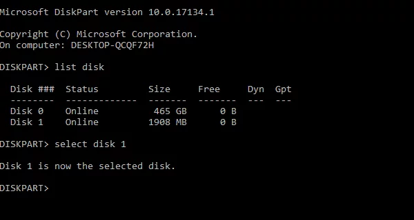 ومن ثم سوف تقوم بتحديد الفلاشة الخاصة بك حتى يمكنك التحكم بها وكتابة هذا الأمر التالي Select disk # في مكان رمز # وبعدها سوف تقوم بكتابة رقم الفلاش كما موضح لك في الصورة السابقة، وعليك الانتباه من كتابة رقم القرص الصلب الخاص بك في حين أنها سوف تفقد جميع الملفات الخاصة بك كما موضح لك في هذا المثال التالي وقد قمت بتحديد الفلاش عن طريق كتابة Select disk 1 ثم سوف يظهر لنا تأكيد بأنه قد تم تحديد الجزء المطلوب.