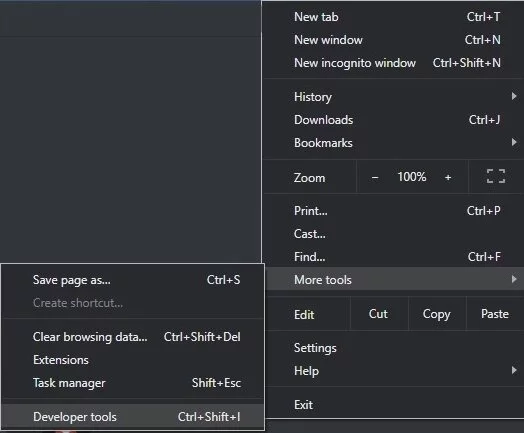 - يمكنك أيضًا فتح نافذة وحدة التحكم عن طريق النقر على النقاط الرأسية الثلاثة الموجودة في أعلى اليمين، ثم انتقل إلى المزيد من More tools ثم Developer tools.