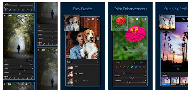 يأتي على راس قائمة تطبيقات تصميم ستوري انستقرام التطبيق الاكثر من رائع Adobe Lightroom متعدد الاستخدامات فيمكنك من خلاله تعديل الصور بشكل رائع من خلال تحسينات الاضاءه و الألوان و القص و الحذف من داخل الصور و الفلاتر المجانية الرائعه بخلاف الفلاتر المدفوعه .