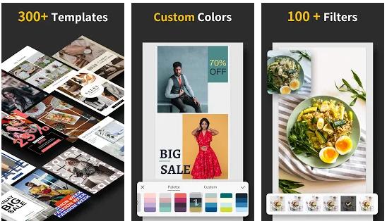 و يعتبر التطبيق مخصص بشكل كبير للاعلانات من خلال الستوري و يسمح لك باختيار الوان التأثيرات المناسبه للاعلانك و يوجد قوالب الموضة و الجمال و التخفيضات و التسوق و الطعام و السفر و التصوير و اللياقة البدنية و الديكورات و الهندسة المعمارية و غيرها الكثير و هو مجاني و لكن مع عناصر مدفوعه قابله للشراء داخل التطبيق.