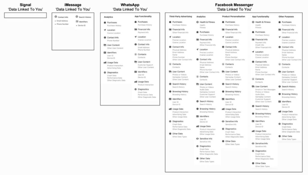 و الصورة ادناه نشرها الحساب الرسمي لتطبيق سيجنال على تويتر و يوضح ما يجمعه كل من واتساب و ماسنجر الخاص بفيسبوك و تطبيق iMessage عنك في مقابل تطبيق سيجنال الذي لا يجمع اي بيانات .