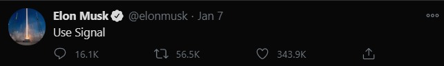 بعد ذلك اوصى ايلون ماسك في تويته على حسابه الرسمي على تويتر باستخدام تطبيق سيجنال مما يعتبر الامر اكثر امانا .