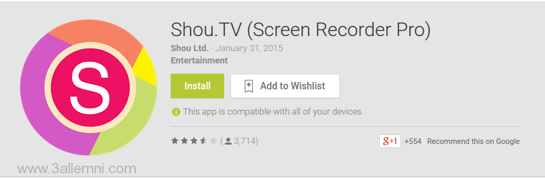 يعد هذا التطبيق ايضا واحدا من افضل التطبيقات المتواجده لتسجيل شاشه الاندرويد فيديو و يختلف هذا التطبيق عن التطبيقات السابقه لانه لا يحتاج الى عمل روت للهاتف لكى تستطيع تشغيله للهواتف التى تعمل على اصدار 5.0 و لكن الهواتف التى تعمل على اصدار 4.4 سوف تحتاج الى عمل روت للهاتف و يمكنكم تحميل هذا التطبيق من متجر جوجل : Shou TV