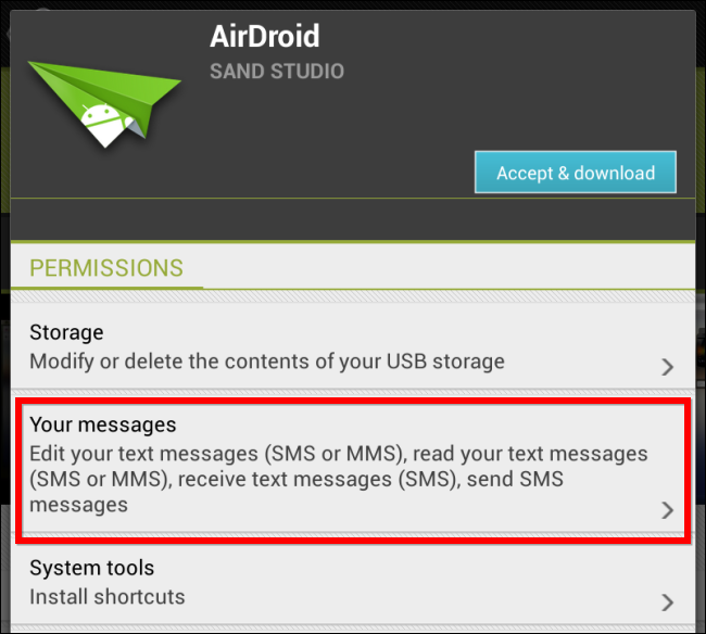 يجب عليكم الانتباه الي التصاريح التي تأخذها التطبيقات عند التحميل فكما ترون في الصوره بالاسفل ان هذا التطبيق مثلا سيأخذ صلاحية ارسال الرسائل لذا يجب عليكم الا تقوموا بتنصيب التطبيقات المشبوهه والحاصله علي تقييم قليل وتعليقات سلبيه