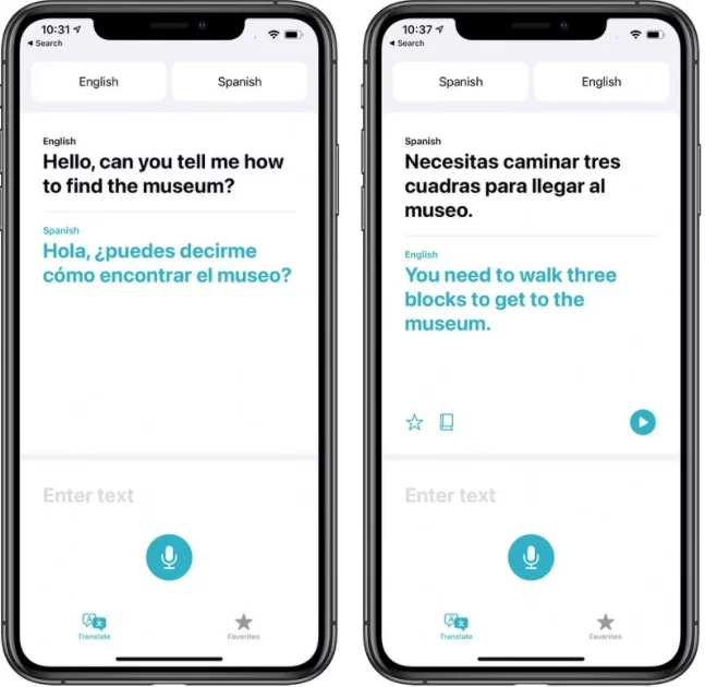 بعد ان كانت siri تقوم بترجمة الكلمات و العبارات في ios 13 توسعت الخدمه بشكل افضل ليصبح هناك تطبيق خاص بسلسلة الايفون من اجل الترجمه من و الى لغات متعددة ما يقارب من 11 لغة .