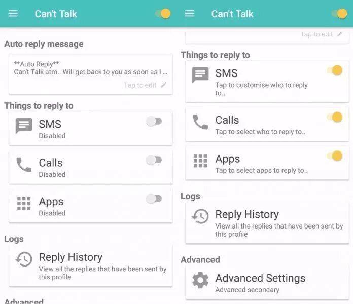 وبالرغم من أن هذا التطبيق لا يتيح لك الكثير من خيارات التطبيقات المذكورة سابقًا إلا أنه ما زال يعتبر بديلًا جيدًا، حيث يوفر لك إمكانية تفعيل الردود التلقائية كما يمكنك تخصيص رد تلقائي للإجابة على رسائلك في حالة كنت مشغولًا أو تقود السيارة أو كنت نائمًا.