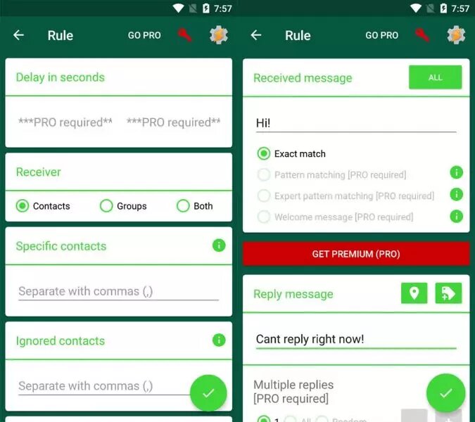 يتيح لك هذا التطبيق أيضًا إمكانية تحديد جهات الاتصال التي تريد تفعيل الرد التلقائي عليها وكذلك جهات الإتصال التي لا تريدها، كما أن التطبيق يوفر لك إمكانية تفعيل الردود الذكية من أجل الإجابة على الأسئلة البسيطة مثل ساعات العمل وكذلك الأسعار إذا كنت تتعامل مع العملاء.