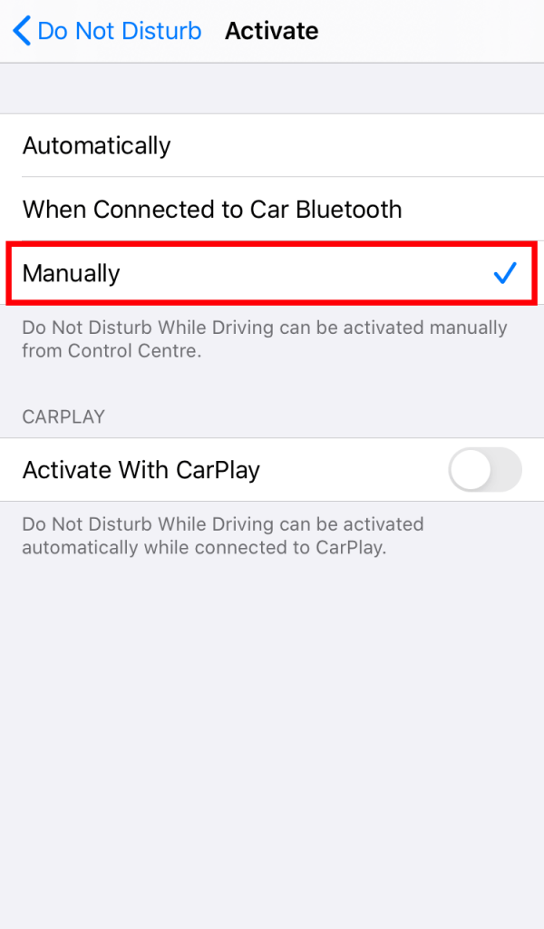- قم بالبحث عن كلمة تنشيط “Activate” أسفل وضع عدة الإزعاج أثناء القيادة “Do Not Disturb While Driving” ثم قم بتغييرها إلى يدويًا Manually.