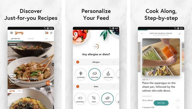 يحتوي Yummly على ما يفوق 2 مليون وصفة مختلفه الاطباق و تأتي كل وصفة مع إرشادات خطوة بخطوة ستتمكن من خلالها الطهي بسهوله و يضيف التطبيق الالاف من الوصفات اسبوعيا و يعتمد التطبيق على تقديم لك وصفات من اشهر منتديات الطعام في العالم و يضيف لك العديد من مقاطع الفيديو التي تساعدك على الطهي السلس دون مشاكل و يمكنك من خلاله تجنب رؤية الوجبات التي لديك حساسيه منها او عرض الوجبات التباتيه فقط و يمكنك إنشاء مجموعات الوصفات الخاصة بك عن طريق حفظ الوصفات التي تنال اعجابك و هو تطبيق مجاني و لكن يمكنك شراء عناصر اضافيه من داخل التطبيق .