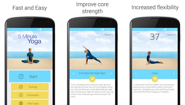 كما هو مذكور في إسمه التطبيق يعتمد على تمارين تستغرق 5 دقائق يومياً لممارسة رياضة اليوجا، التي هي واحده من أقدم الرياضات والتمارين التي تفيد العقل بشكل كبير نفسيا وفيزيائياً وتريح النفس وتجلب الثقه كما أنها تقوي التركيز لممارسي هذه الرياضة، غير أن من المعروف عنها أنها تجعل الجسم في حالة مرونه غير عادية لأصحاب هذا التمرين.