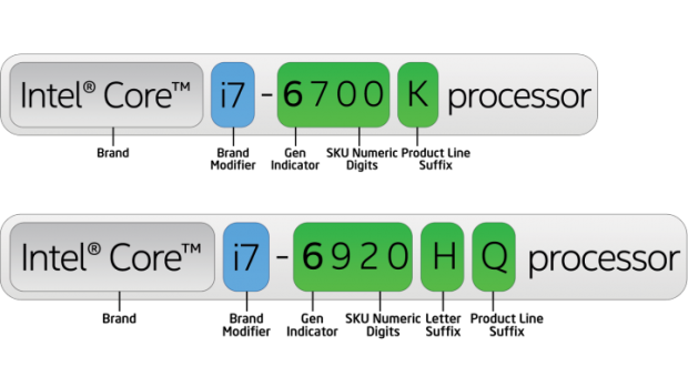 بعد رقم عائلة ال Intel Core التي تكون i3 أو i5 أو i7 يكون هنالك رقم مكون من أربعة أرقام , يكون الأول علي اليسار هو رقم جيل المعالج Processor Generation و باقي الأرقام تكون رقم أصدار هذا النوع من جيل المعالج و يطلق عليها أسم SKU و كما زادت قيمة تلك الأرقام في نفس الجيل من المعالجات فأنها تدل علي حداثة المعالج , و نجد بعد تلك الأرقام حرف أو أكثر من حرف و تدعي تلك الحروف Suffiix و هي تدل علي بعض مميزات و خصائص المعالج .