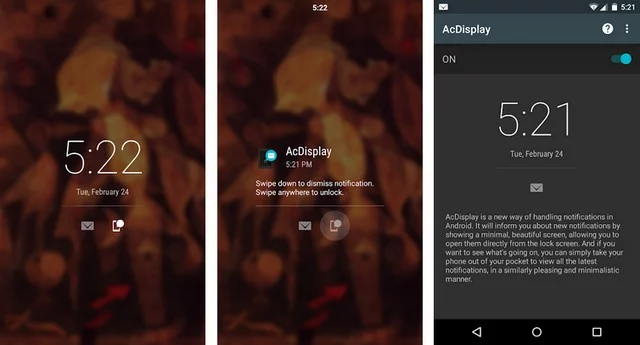 تطبيق AcDisplay تطبيق مميز بخاصية ال Always-on التي تبقي الشاشة مضيئة على الساعة والوقت والتاريخ فقط، وتقوم أيضاً بحفظ الطاقة، هذه الخاصية مثلما أتت في هواتف سامسونج المعروفة كما أنه يسمح لك بتشغيل الإشعارات دون فتح قفل الهاتف ومزايا آخرى فريدة من نوعها، السلبي في هذا التطبيق أن آخر تحديث له منذ 2015 ولكن التطبيق مازال يعمل بشكل مرضي وأيضاً يعمل بكفاءة على الهواتف القديمة.
