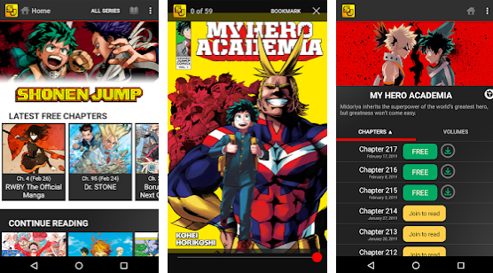 تطبيق Shonen Jump هو عبارة عن تطبيق مانجا مميز جدًا، يهتم هذا التطبيق ببعض الأجزاء من سلسلة المانجا Shonen Jump والتي يتم نشرها بشكل أسبوعي مثل Dr. Stone و Boruto و One Piece. ويتميز هذا التطبيق بالتحديث المستمر والسريع للحلقات حيث يمكنك الإستماع للحلقات مباشرةً فور صدورها في اليابان.