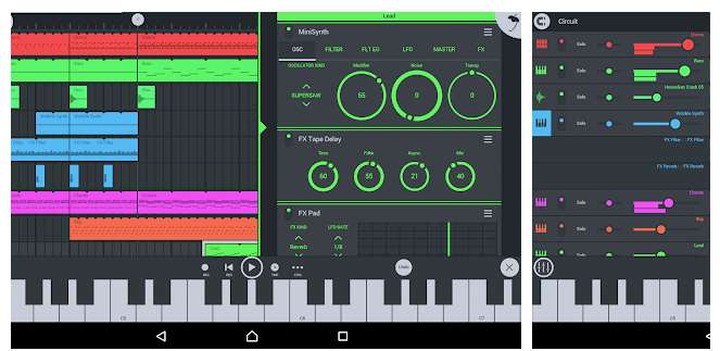 احد التطبيقات الرائعه التي تحتوي على مجموعة من الأدوات للموسيقى ذات النمط الإلكتروني مثل Electronica و techno و hip-hop مع توليف “synthesizers” عالي الجودة و داخل التطبيق ستجد ايضا لوحة مفاتيح البيانو الافتراضية القابلة للتكوين و منصات الطبل “Drum Pads” مع مجموعة عديده من التأثيرات الصوتية الرائعه و في بداية التطبيق كان اداءه ضعيفا بعض الشىء لكنه تحسن مع الوقت و التطوير و يمكنك من خلال التطبيق اضافة النغمات والأوتار و تحريرها و يساعدك على حفظ و تحميل الأغاني الخاصة بك والتصدير بصيغة WAV ، MP3 & FLAC و هو مجاني مع عناصر مدفوعه داخل التطبيق .