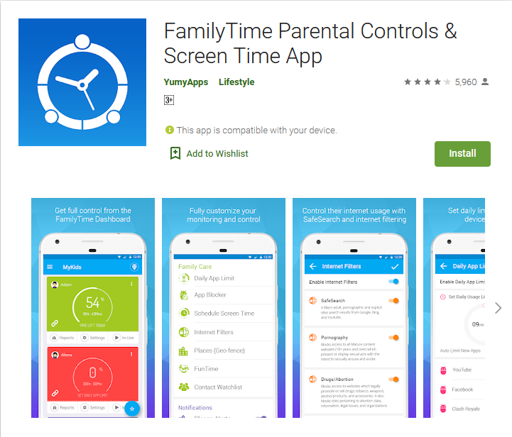 يعد FamilyTime واحد من افضل تطبيقات الرقابة الابوية لاجهزة اندرويد فهو يقوم بتخصيص و التحكم في المحتوى الذي تسمح لطفلك ان يراه و كذلك يمكنك تعيين حد زمني يومي لتطبيقات معينة حتى لا يقضي الطفل اكثر من اللازم على هذه التطبيقات بالاضافه لتعيين الواجبات المنزلية و أوقات النوم و يمكنك معرفة موقع طفلك و ينبهك التطبيق في حالة خرج طفلك عن اطار منطقه جغرافية معينه و يسمح لك التطبيق ايضا بجدولة وقت الشاشة ، حتى لا يستخدم طفلك الهاتف الذكي إلا في الوقت المحدد و يمكنك من خلاله مراقبة جهات الاتصال و الرسائل ايضا مما يجعله تطبيق محكم للغايه .