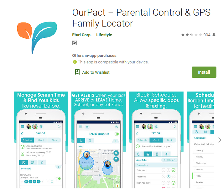 يأتي من ضمن قائمة افضل تطبيقات الرقابة الابوية لاجهزة اندرويد التطبيق الشهير OurPact و هو من التطبيقات التي يسهل التعامل معها و يمكنك OurPact من حظر الرسائل و التطبيقات و الوصول إلى الإنترنت و جدولة وقت الشاشة لطفلك و يمكنك ايضا من اختيار التطبيقات التي ستظهر على الهاتف الذكي لطفلك و يعمل التطبيق على تنبيهك عندما يغادر طفلك المدرسة و يصل إلى المنزل و يساعدك التطبيق على حظر فئات كاملة من التطبيقات و حظر جميع المواد الإباحية و ما يميز هذا التطبيق انك ستحصل على تنبيهات كلما قام طفلك بتثبيت تطبيق جديد بالاضافه الى خاصية محدد مواقع العائلة الذي من خلاله يمكنك تحديد موقع أي فرد من أفراد العائلة و يساعك التطبيق على تتبع موقع اطفالك بسهوله .