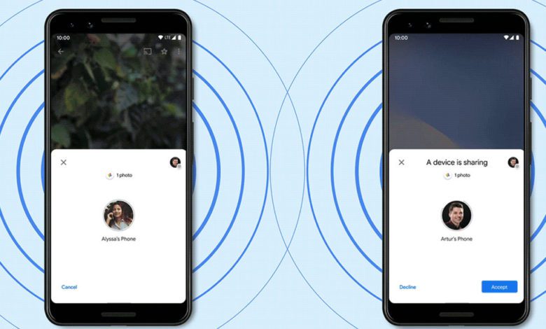 قم باختيار الصور او مقاطع الفيديو او الملفات التي ترغب في نقلها و اختر مشاركة ثم اضغط على علامة nearby share و تأكد من تشغيل البلتوث كذلك لديك و لدى الشخص الاخر الذي ترغب في نقل الملفات اليه و بمجرد اكتشاف الهاتف الاخر اضغط عليه ليتم ارسال الصور اليه و لن يستغرق الامر وقتا طويلا .