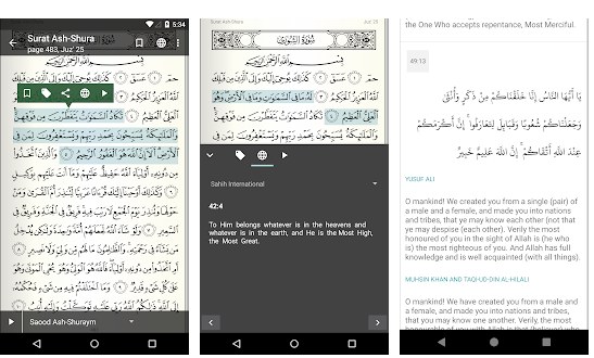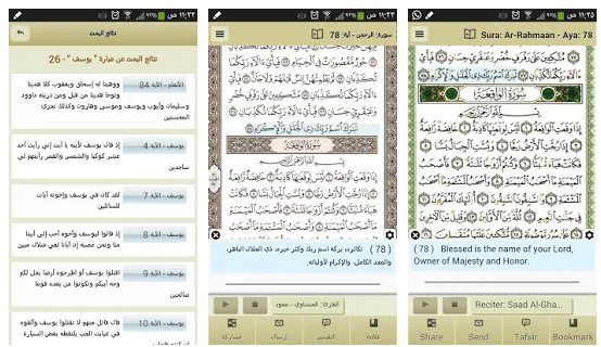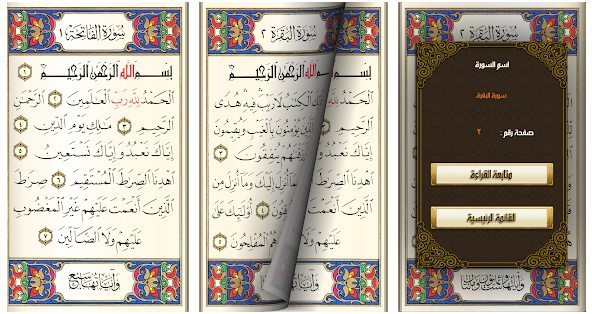 واحد من افضل تطبيقات القران الكريم للاندرويد و متوفر مجانا على متجر بلاي و يحتوي على الصور بالخط العثماني مع امكانية استخدام ميزة الوضع الليلي لاراحة العينين او الوضع النهاري لتصبح لون الصفحات بيضاء بالاضافه الى تفسير ابن كثير و السعدي بالضغط المطول على الاية و امكانية نسخها بالتشكيل .