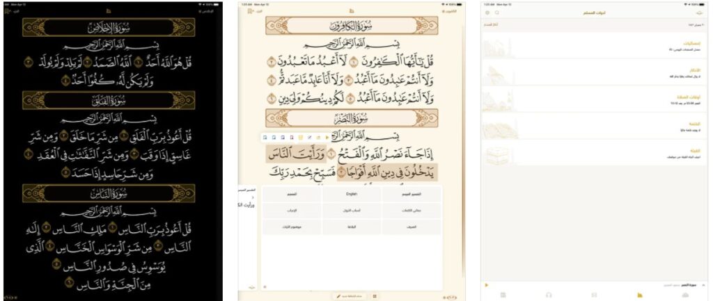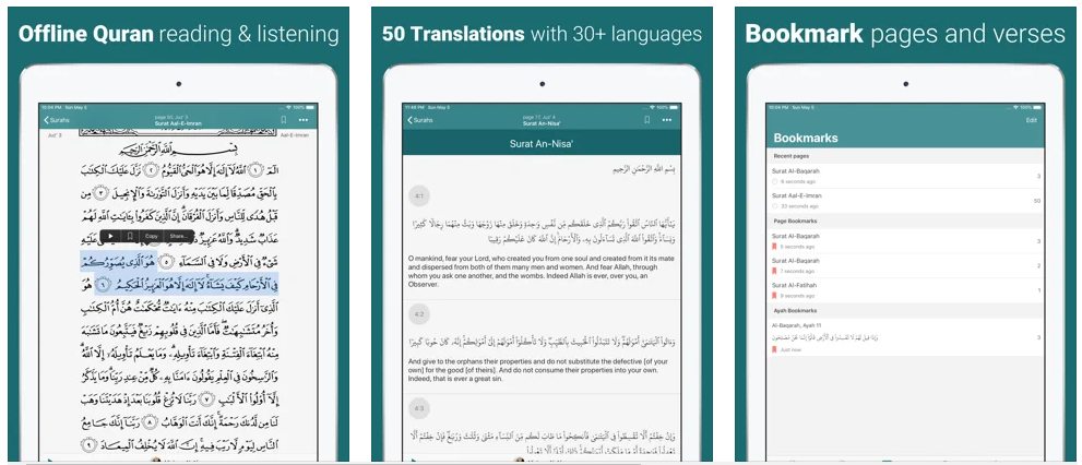واحدا من افضل تطبيقات القران الكريم على متجر ابل و هو خالي تماما من الاعلانات و سوف تتمكن بسهولة من تلاوة القران الكريم سواء على الايباد او الايفون بالاضافه الى قائمة رائعه من قراء القران الكريم للاستماع و يأتي التطبيق مع ميزات جديده تسمح بمزامنة استخدامك للتطبيق مع حسابك على ايكلاود و مع الضغط لفتره طويلة مع التحريك على الايه يمكنك حفظها او الحصول على تلاوتها اذا كنت غير متأكد من النطق الصحيح لها او نسخها و هو تطبيق مجاني .